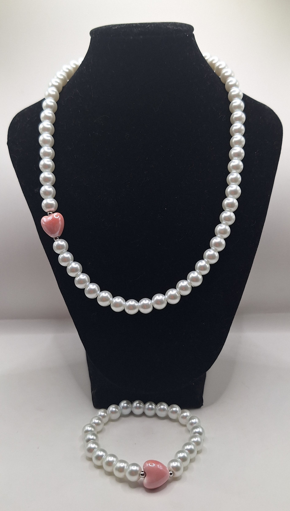 искусственный жемчуг 8мм,сердечко керамика 1.4см,на резинке. На фото браслет 17-18р. Возможно изготовление других размеров. Можно добавить колье