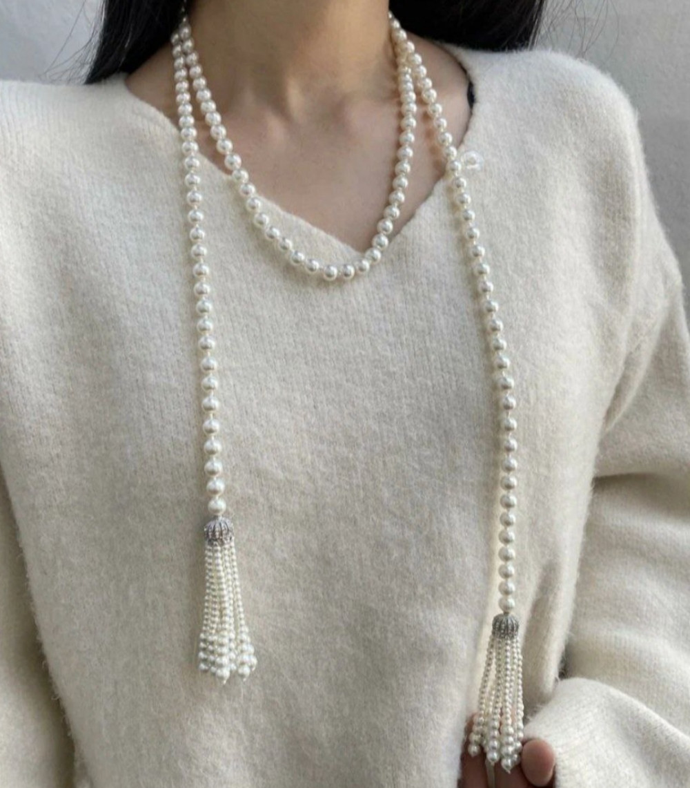 Общая длина 1.5метра Бусины бело-бежевые 8ми. Это колье можно носить в разных вариантах как бусы,как сотуар. Самый модный вариант сезона 2026-когда кисти свисают по спине.